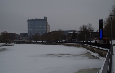 Öine vaade Kivisillalt: Emajõe paremkallas. Taga turuhoone, võõrastemaja Central.