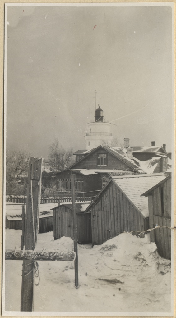 Narva-Jõesuu (Narva) tuletorn. Vaade põhjast. Esiplaanil puidust hooned.