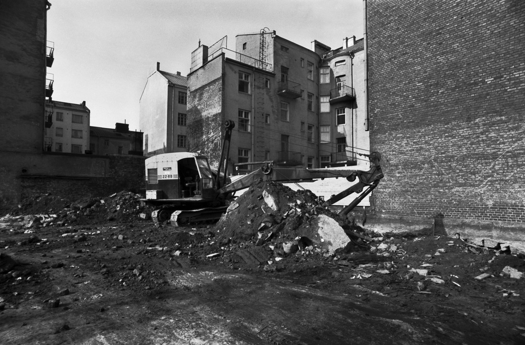 Abrahaminkatu 4. Kalevankatu 49. Rakennustyömaa, jonne Rakennustoimisto Lauri Viding Oy rakentaa arkkitehti Toivo Korhosen suunnitteleman kerrostalon