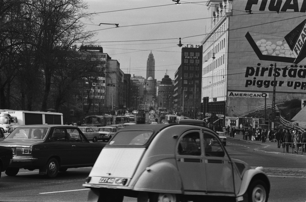 Ruuhkaliikennettä Unioninkadulla. Näkymä Kaisaniemenkadun risteyksestä Siltasaaren suuntaan. Etualalla Citroën 2CV rättisitikka. Oikealla Unioninkatu 45:n talon päädyssä Figarol-pastillimainos, taustalla Kallion kirkko.