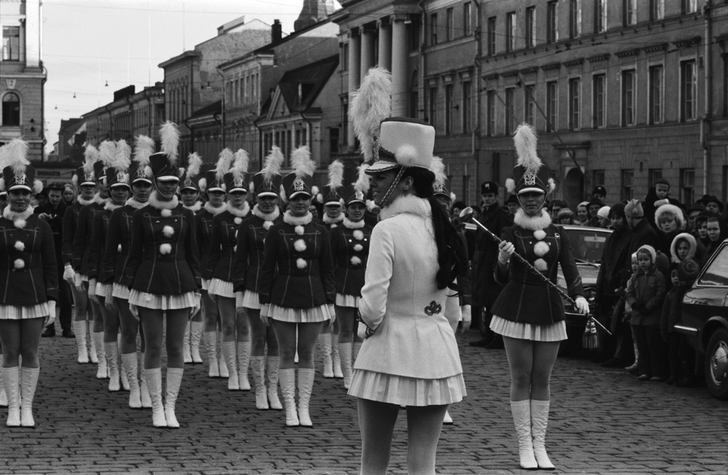 Kruununhaka, Senaatintori. Töyhtöhattuisia naisia Satu Östringin johdolla Senaatintorilla valmistautumassa Aleksanterinkadun joulukadun avajaisparaatiin.
