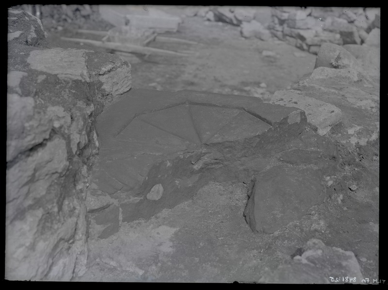 Pirita kloostri väljakaevamised. Vaade kaevendile, esiplaanil käärkambri müürikivis leitud käepesunõu