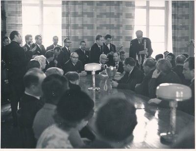Tartu ülikool, õpetatud nõukogu saal, president U.K. Kekkoneni vastuvõtmine. Kõneleb rektor F. Klement. Tartu, 1964.