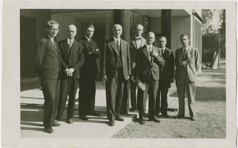 Ülikonnas, valge pluusi ja lipsuga mehed poseerimas fotograafile vastvalminud kunstihoone peasissepääsu sammaste ees. Paremalt: Juhan Raudsepp, Rudolf Sajor, Edgar Johan Kuusik (joonised käes), Anton Lembit Soans, Voldemar Päts, August Jansen, Voldemar Vaga ja Herman Halliste