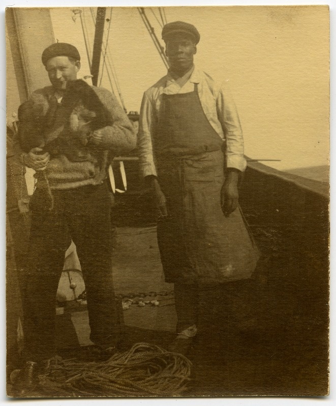 Ivan Randmets(?) hoidmas kahte ahvi süles. Tema kõrval tundmatu meremees.