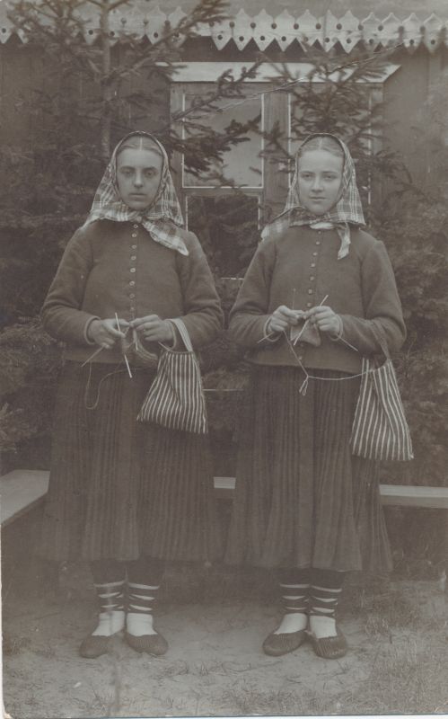 Foto. Kaks noort Vormsi neidu maja juures kudumas sukka, triibulised sukavarda kotid, u. 1930. Johanna Menerti kogu
